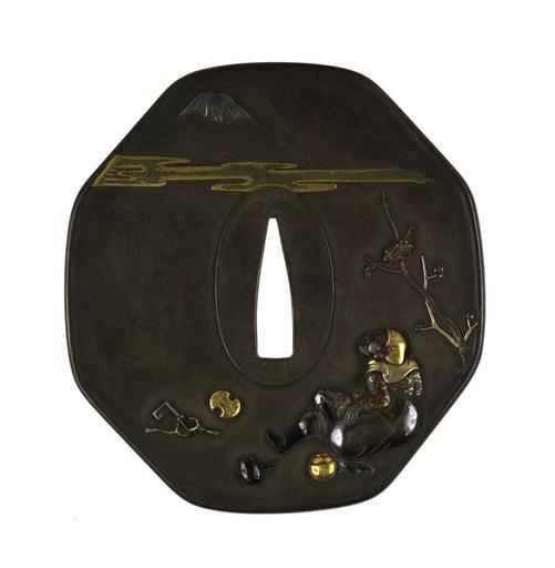 Keywords: Oishi Akichika - Tsuba with the Treasures of the Seven Gods of Good Fortune - Walters 51215.jpg This tsuba shows a man gazing up at Mount Fuji surrounded by some of the attributes of the Seven Gods of Good Fortune These are the contents of the treasure bag carried by Hotei one of the gods The man rests against Hotei's bag Next to the bag is a sacred jewel At the bottom of the tsuba is Daitoku's hammer Just above the hammer is a sacred key The disk on the left with notches on two sides is a coin Mount Fuji can be seen in the upper left On the reverse branches of cherry blossoms frame the upper portion of the tsuba Along the bottom from right to left are an inexhaustible bag of money another coin a feather cape a bale of rice a hat the makes the wearer invisible and another treasure jewel 1851 late Edo shibuichi gold silver shakudo cm 9 8 4 0 45 accession number 51 215 13635 Henry Walters Baltimore date and mode of acquisition unknown Walters Art Museum Henry Walters Acquired by Henry Walters Inscrioption kaei kanotoi nanryo/akichika; Translation August 1851/Akichika place of origin Edo present-day Tokyo Japan Walters Art Museum license Tsuba in the Walters Art Museum Oishi Akichika Media contributed by the Walters Art Museum needs category review |