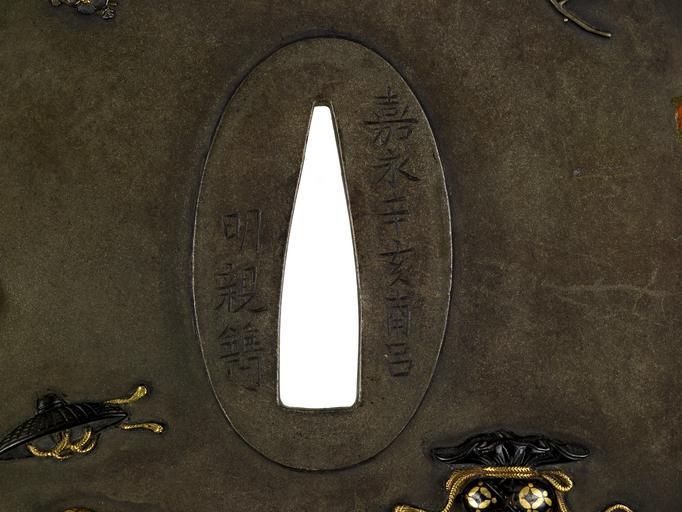 Keywords: Oishi Akichika - Tsuba with the Treasures of the Seven Gods of Good Fortune - Walters 51215 - Mark.jpg This tsuba shows a man gazing up at Mount Fuji surrounded by some of the attributes of the Seven Gods of Good Fortune These are the contents of the treasure bag carried by Hotei one of the gods The man rests against Hotei's bag Next to the bag is a sacred jewel At the bottom of the tsuba is Daitoku's hammer Just above the hammer is a sacred key The disk on the left with notches on two sides is a coin Mount Fuji can be seen in the upper left On the reverse branches of cherry blossoms frame the upper portion of the tsuba Along the bottom from right to left are an inexhaustible bag of money another coin a feather cape a bale of rice a hat the makes the wearer invisible and another treasure jewel 1851 late Edo shibuichi gold silver shakudo cm 9 8 4 0 45 accession number 51 215 13635 Henry Walters Baltimore date and mode of acquisition unknown Walters Art Museum Henry Walters Acquired by Henry Walters Inscrioption kaei kanotoi nanryo/akichika; Translation August 1851/Akichika place of origin Edo present-day Tokyo Japan Walters Art Museum license Tsuba in the Walters Art Museum Oishi Akichika Media contributed by the Walters Art Museum needs category review |