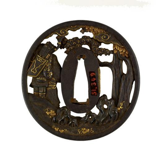 Keywords: Okamoto Naoshige - Tsuba with Two Figures with a Chinese Lion-Dog - Walters 51349 - Back.jpg The openwork design on this tsuba features two figures standing at the right The one in the rear carries a quiver of arrows and a bow He is blowing a long horn The figure in front holds a Chinese style lion-dog shishi on a leash This animal did not exist but is derived from Chinese and Japanese interpretations of stories and paintings of lions in India ca 1765 Edo iron gold copper shakudo cm 7 6 88 0 5 accession number 51 349 11246 Henry Walters Baltimore date and mode of acquisition unknown Walters Art Museum Henry Walters Acquired by Henry Walters Signature Tetsugendô; Seal Kotobuki place of origin Kyoto Japan Walters Art Museum license Tsuba in the Walters Art Museum Okamoto Naoshige Media contributed by the Walters Art Museum needs category review |