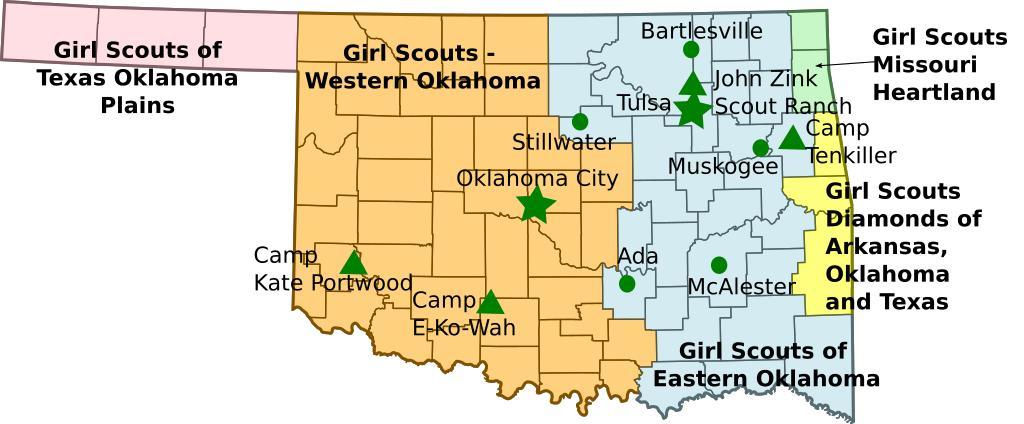 Keywords: Oklahoma-gsusa.svg Map of Girl Scout Councils in Oklahoma own original text my work based on wikipedia county map 1 <br/> Originally uploaded on en wikipedia - Transferred by The Bike Dude 2009-02-05 Emma Pease Erp Original upload log en wikipedia Oklahoma-gsusa svg Transferred to Commons Upload date User Bytes Dimensions Comment 2009-02-05 23 53 49 Erp 137786 9640×3989 <small><nowiki>non inkscape version</nowiki></small> 2009-02-05 23 52 16 Erp 143039 9640×3989 <small><nowiki> Map of Girl Scout Councils in Oklahoma my work based on wikipedia county map 2009-02-05 Emma Pease </nowiki></small> Scouting in Oklahoma Girl Scouts of the USA Council maps |