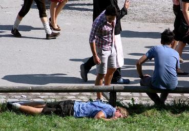 Keywords: Oktoberfest 2011 drunk male sleep.JPG de Oktoberfest in München Betrunkener Mann schläft seinen Rausch aus Anderer Oktoberfestbesucher schaut nach dem Betrunkenen und prüft ob dieser Hilfe braucht own Usien 2011-09-17 Cc-zero Oktoberfest 2011 Drunken males People lying on the ground |