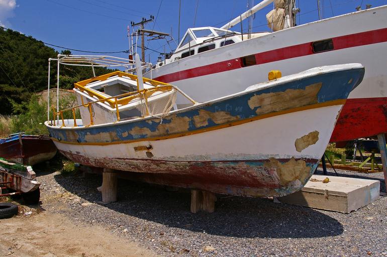 Keywords: old boat fishing vessel cutter old new weathered turned off fishing summer samos boats greece greek island holiday greek sea island opposites lapsed fishing village seafaring ship sky port boat harbour coast sun mediterranean ship wreck