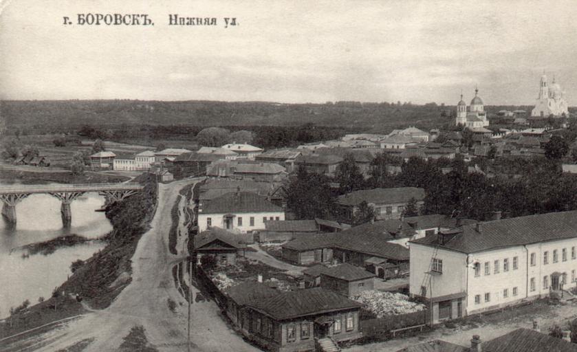 Keywords: Old Borovsk by A.V.Muratova. Nizhnaya Street.jpg Бо овск Вид восточного п едместья - начало сов улицы Циолковского - п едположительно с Введенской а тогда Пок овской це кви больше неоткуда п ичём именно с це кви а не с колокольни - судя по д угим фото в набо е колокольни тогда еще не было а пе еднем плане земская больница Отк ытка 1910 или 1913 года Фотог афия А В у атовой Borovsk Eastern suburb town's hospital in foreground Photo by A V Muratova printed either in 1910 or in 1913 http //borovskold ru/content php page outgallery num 1 gid 1 id 19719093 or 1910 1913 A V Muratova PD-RusEmpire 55 12 28 80005182664604 N 36 29 35 77986717224121 E ImageNote 1 146 247 180 67 1024 625 2 thumb left ачало сов улицы Энгельса ImageNoteEnd 1 ImageNote 2 801 126 83 141 1024 625 2 Т оицкая це ковь снесена ImageNoteEnd 2 ImageNote 3 344 332 182 102 1024 625 2 thumb left Севе ные ко пуса больницы ImageNoteEnd 3 ImageNote 4 334 405 219 86 1024 625 2 thumb left Севе ные ко пуса больницы ImageNoteEnd 4 ImageNote 5 730 370 293 201 1024 625 2 Главный ко пус больницы сейчас здесь кажется жилой дом ImageNoteEnd 5 ImageNote 6 923 118 100 110 1024 625 2 thumb left Пок овский собо вто ой общины ImageNoteEnd 6 Borovsk in 1910-1913 Tsiolkovskogo Street Borovsk 01 Protva River in Borovsk Zemstvo