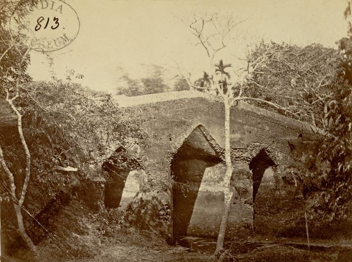 Keywords: Old bridge, called Dullalpur pul, Painam, Sonargaon 1872 2.jpg en Photograph of Dullalpur pul Painam Sonargaon near Dhaka in Bangladesh from the Archaeological Survey of India Collections taken by W Brennand in 1872 Painam Panam or Panamnagar is situated in Bangladesh close to the banks of the Meghna River 15 miles east of Dacca Panam was perhaps the residence of the early Muslim governors of Eastern Bengal whose capital was at Sonargaon a thriving port and commercial centre nearby The city was later a centre of trade in cotton fabrics carried out by the East India Company The brick bridge in this view is described in J Wise Notes on Sunargaon Eastern Bengal Journal of the Asiatic Society of Bengal vol XLIII part I Calcutta 1874 p 91 'Painam although a most singular village possesses few ancient buildings There is however a fine Muhammadan bridge of three arches called the Dallalpur pul over which the road goes to the Kampani ka kot'hi ' 1872 http //www bl uk/onlinegallery/onlineex/apac/photocoll/o/019pho001000s27u02733000 html Brennand W Custom license marker 2013 01 06 PD-Bangladesh Uploaded with UploadWizard Brennand W Old vintage photographs of Bangladesh Stone arch bridges in Bangladesh |