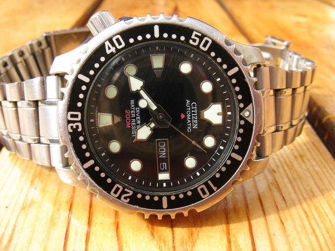Keywords: old clock wrist watch clock time indicating time watches time of mens clock face analog clock hour minute hand hour hand automatic watch used not new diver's watch movement waterproof stainless steel metal mechanics rubies japan date ad