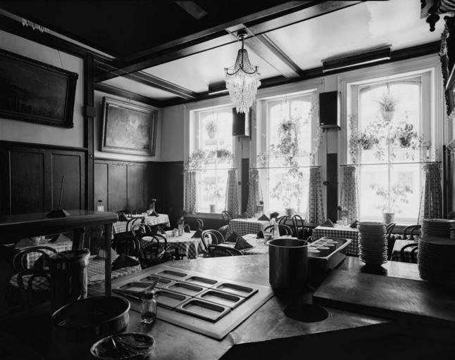 Keywords: Old Ebbitt Grill Old F Street Location second floor breakfast room south 1967.jpg en Looking south at the Breakfast Room on the second floor of the Old Ebbitt Grill located at 1427 F Street NW Washington D C United States Old Ebbitt Grill was originally a restaurant which existed as part of the Ebbitt House hotel which was established in 1856 The hotel was located on the southeast corner of F Street and 14th Street in Washington D C The original hotel was razed in 1872 and a newer much larger hotel with a greatly expanded and much more luxurious dining room built The dining room was significantly renovated in 1910 Ebbitt House closed in 1925 and the restaurant's furnishings were purchased by Anders R Lofstrand Sr a local restauranteur and veteran bar owner The Old Ebbitt Grill restaurant was moved to 1427 F Street NW Lofstrand occupied all four floors of this existing building The restaurant passed into the hands of the Clyde's Restaurant Group in 1970 after a tax auction In 1977 the building was demolished to make way for the Metropolitan Square development However Old Ebbitt Grill re-established itself on the northwest corner of Metropolitan Square at 675 15th Street NW It remains in existence as of 2012 and is the oldest bar and restaurant in the city http //www loc gov/pictures/item/dc0193/ Historic American Buildings Survey Prints and Photographs Division Library of Congress 1967 PD-USGov-Interior-HABS Old Ebbitt Grill 1926 location |