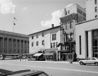 Keywords: Old Ebbitt Grill Old F Street Location front looking northwest 1967.jpg en Looking northwest at the front entrance to the Old Ebbitt Grill located at 1427 F Street NW Washington D C United States To the left of Old Ebbitt Grill is Rhodes Tavern a historic tavern in Washington D C It was the site of the first citizens' meeting in the city and the first election and several British generals drank in the tavern during the Burning of Washington during the War of 1812 Across the street to the left of the image is the U S Treasury Building Old Ebbitt Grill was originally a restaurant which existed as part of the Ebbitt House hotel which was established in 1856 The hotel was located on the southeast corner of F Street and 14th Street in Washington D C The original hotel was razed in 1872 and a newer much larger hotel with a greatly expanded and much more luxurious dining room built The dining room was significantly renovated in 1910 Ebbitt House closed in 1925 and the restaurant's furnishings were purchased by Anders R Lofstrand Sr a local restauranteur and veteran bar owner The Old Ebbitt Grill restaurant was moved to 1427 F Street NW Lofstrand occupied all four floors of this existing building The restaurant passed into the hands of the Clyde's Restaurant Group in 1970 after a tax auction In 1977 the building was demolished to make way for the Metropolitan Square development However Old Ebbitt Grill re-established itself on the northwest corner of Metropolitan Square at 675 15th Street NW It remains in existence as of 2012 and is the oldest bar and restaurant in the city http //www loc gov/pictures/item/dc0193/ Historic American Buildings Survey Prints and Photographs Division Library of Congress 1967 PD-USGov-Interior-HABS Old Ebbitt Grill 1926 location