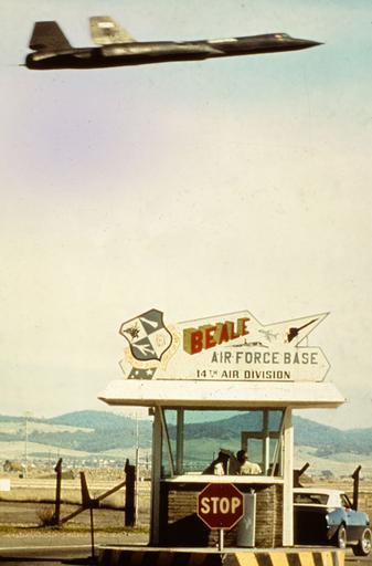Keywords: Old Gate, Beale AFB.jpg en An SR-71 Blackbird flies over the the old gate at Beale Air Force Base circa 1970s Courtesy photo/9th Reconnaissance Wing 2012-11-16 08 05 38 http //www flickr com/photos/airmanmagazine/8515663991/sizes/o/ U S Air Force PD-USGov Uploaded with UploadWizard Aircraft at Beale Air Force Base SR-71 Blackbird in flight |
