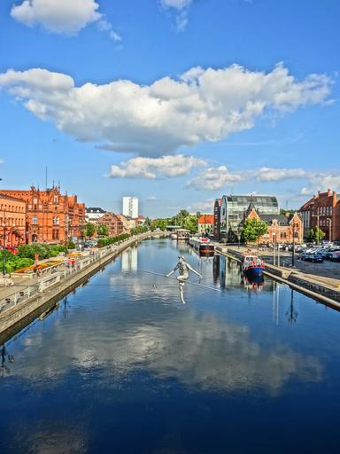 Keywords: old town bridge bydgoszcz canal river statue sculpture acrobat urban poland