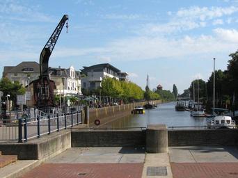 Keywords: oldenburg germany city town buildings crane boats canal water waterway reflections trees architecture summer spring outside