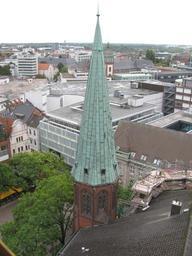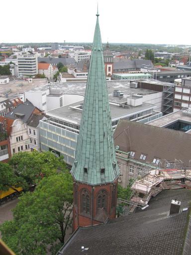 Keywords: Oldenburg Lambertikirche Treppenturm.JPG en Oldenburg Lower Saxony Germany View from the bell tower of St Lambert Church to one of the stair towers of the church and the market place de Oldenburg Oldb Lambertikirche Blick vom Glockenturm auf einen der vier großen Treppentürme Es handelt sich um den nordöstlichen Turm Links davon der Marktplatz own Anaconda74 2013-09-08 Oldenburg Lambertikirche Copper roofs in Lower Saxony Stair towers in Germany Cc-zero |