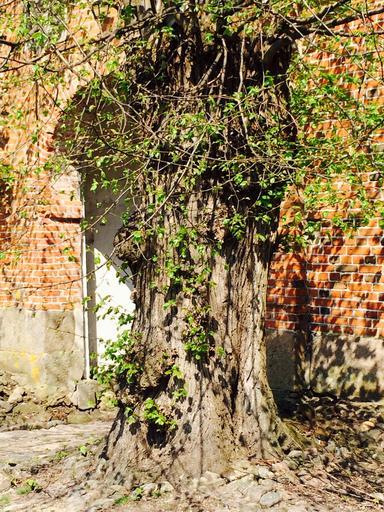 Keywords: older tree gnarled leaves aesthetic home wall masonry tribe log green building