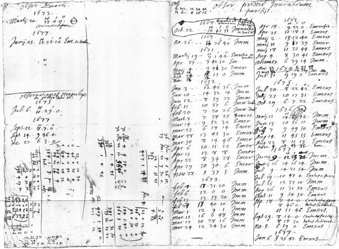 | Keywords: Ole Rømer - Obser. Primi Jovialium Parisiis - pp1+4.jpg LargeImage Page 1 right and 4 of the list of eclipses of the Jupiter moon Io that formed the basis of Ole Rømer's discovery of the finite speed of light The Latin title Obser Primi Jovialium Parisiis translates to Observations of the first Jupiter moon in Paris Page 1 lists emersions and immersions of Io observed between 1668 and 1678 The first observation circled is marked should according to everyone's opinion be excluded The top of page 4 lists observations of the fourth moon of Jupiter Callisto At the lower half are a couple of attempts to match the number of revolutions Rev of Io with an average orbiting time for three periods 76-77 71-72 and 72-73 Next to them are what according to Meyer p 19 appears to calculations of an average value of the time it takes light to travel a distance equal to the Earth orbit radius ca 11 minutes At the bottom written upside down are calculations of eclipses in Paris based on observed eclipses at Uranienborg Side 1 til højre og 4 af listen over formørkelser af Jupitermånen Io der dannede grundlaget for Ole Rømers opdagelse af lysets tøven Den latinske titel Obser Primi Jovialium Parisiis kan oversættes til Observationer af den første Jupitermåne i Paris Side 1 er en liste over emersioner og immersioner af Io observeret mellem 1668 og 1678 Den første obersvation indcirklet er mærket med bør efter alles mening ekskluderes Toppen af side 4 består af observationer af Jupiters fjerde måne På den nederste halvdel er forsøg på at matche antallet af omløb Rev af Io med en gennemsnitsomløbstid for tre perioder 76-77 71-72 and 72-73 Ved siden af er ifølge Meyer s 19 tilsyneladende beregninger af en gennemsnitsværdi af den tid det tager lyset at gennemløbe en afstand lig jordbanens radius cirka 11 minutter Nederst skrevet på hovedet er beregninger af formørkelser i Paris baseret på observerede formørkelser i Uranienborg Meyer Kirstine 1915 Om Ole Rømers Opdagelse af Lysets Tøven Det Kongelige Danske Videnskabernes Selskabs Skrifter 7 Række naturvidenskabelig og mathematisk Afdeling XII 3 København Own scan s 1670 first publication in 1915 creator Ole Rømer The original work is in the public domain by age If the 1915 reproduction is photographic it is still public domain because it does not meet the threshold of originality and it was created before 1970 Pages 2 and 3 180px PD-old-100 PD-Denmark50 Rømer's determination of the speed of light |