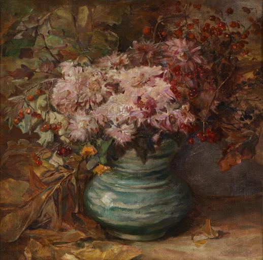 Keywords: Olga Wisinger-Florian Blumenstrauß mit Crysanthemen und Ringelblumen.jpg Blumenstrauß mit Crysanthemen und Ringelblumen in einer Vase oil on canvas rückseitig Nachlassstempel Olga Wisinger-Florian 43 x 43 cm http //www dorotheum com by 1926 Creator Olga Wisinger-Florian PD-old-auto 1926 Images from Dorotheum Olga Wisinger-Florian Still life paintings of flowers |
