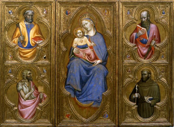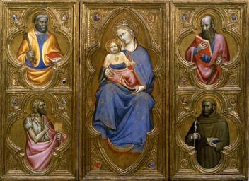 | Keywords: Olivuccio di Ciccarello da Camerino - Madonna and Child with Saints Peter, Paul, John the Baptist, and Francis - Walters 37699.jpg Walters Art Museum artwork Creator Olivuccio di Ciccarello da Camerino The intact condition and unique format of this altarpiece make it a truly remarkable painting The central panel depicts a stunning Madonna and Child flanked on the left by half-length figures of St Peter above St John the Baptist and on the right by St Paul above St Francis of Assisi The Virgin's robe is carved and decorated with gold leaf that shimmered in the candlelight a surface treatment common in Byzantine paintings Because of the crescent moon at her feet the rays emanating from her body and the gold curling through her cloak the Virgin seems to hover behind the frame The molding of the inner frame crops the composition like an open window offering a glimpse into the sacred timeless realm beyond On the back of the left wing are two preparatory drawings by the artist For more information on this piece please see Zeri catalogue number 41 pp 68-71 ca 1410 1420 Medieval oil gold panel Central panel H including frame 63 x W 30 3/8 x D 1 1/4 in 160 x 77 2 x 3 1 cm ; <br>Left wing H including frame 63 1/4 x W 27 9/16 x D 1 1/4 in 160 6 x 70 x 3 1 cm ; <br>Right wing H including frame 63 5/16 x W 27 5/16 x D 1 1/4 in 160 8 x 69 3 x 3 1 cm accession number 37 699 22289 Don Marcello Massarenti Collection Rome prior to 1897 mode of acquisition unknown 1897 catalogue no 30 as Tuscan School early 15th century Henry Walters city Baltimore Walters Art Museum Henry Walters Acquired by Henry Walters with the Massarenti Collection 1902 Transcription Inscribed on Virgin's halo AVE MARIA GRATIA PLENA; Translation Inscribed on Virgin's halo Hail Mary full of grace; Transcription Inscribed on the bottom left panel in two roundels P E; Transcription Inscribed on bottom of right panel in two roundels T R; Inscribed on scroll held by John the Baptist ECCE/AGNVS/DEI QVI/TOLLIS/PECCATA MVNDI; Translation Inscribed on scroll held by John the Baptist Here is the Lamb of God who eliminates the sins of the world God's Minstrel St Francis of Assisi The Walters Art Gallery Baltimore 1982 place of origin Marche Italy Walters Art Museum license 3D Medieval art in the Walters Art Museum Olivuccio di Ciccarello da Camerino Paintings in the Walters Art Museum Madonna and Child |