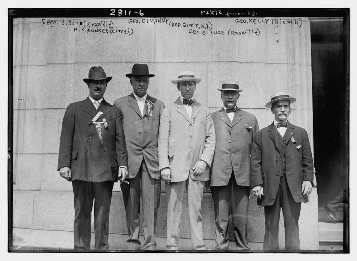 Keywords: Olvany 4101089538 9c4b2723e3 o.jpg en wikipedia 2012 January 12 Bain News Service publisher Samuel Becket Boyd II George Washington Olvanny Kelly Henry Clemons Bunker and George O Luce in 1913 in New York City They may have been meeting for the dedication of the Firemen's Memorial in Riverside Park in Manhattan in New York City on September 5 1913 Note that they have shared pins and pennants with each other 1 negative glass ; 5 x 7 in or smaller Notes Title from unverified data provided by the Bain News Service on the negatives or caption cards Forms part of George Grantham Bain Collection Library of Congress Format Glass negatives Rights Info No known restrictions on publication Repository Library of Congress Prints and Photographs Division Washington D C 20540 USA hdl loc gov/loc pnp/pp print General information about the Bain Collection is available at hdl loc gov/loc pnp/pp ggbain Persistent URL hdl loc gov/loc pnp/ggbain 14085 Call Number LC-B2- 2811-6 ggbain 14085 en wikipedia 2009-11-19 Richard Arthur Norton 1958- wikipedia en Cropped images multiple image center center Samuel Becket Boyd II 1865-1929 circa 1913 in Manhattan png Henry Clemons Bunker 1856-1938 circa 1913 in Manhattan png George Washington Olvany 1876-1952 circa 1913 in Manhattan png clear People Samuel Becket Boyd II 1865-1929 was the fire chief of Knoxville Tennessee who died of a heart attack in the line of duty in 1929 Henry Clemons Bunker 1856-1938 was the fire chief of Cincinnati Ohio from 1912 to 1916 George Washington Olvany 1876-1952 was the deputy fire chief of New York City New York George O Luce 1876-1922 was the fire chief of Ilion New York in 1918 In the image he is incorrectly identified as being from Knoxville Tennessee but the fire chief of Knoxville is already identified George Kelly fireman of Bismarck North Dakota George Washington Olvany 1876-1952 He was the deputy New York City Fire Commissioner and leader of Tammany Hall <ref name time> cite news Death of Brennan http //www time com/time/magazine/article/0 9171 881173 00 html George Washington Olvany under the careful guidance of Governor Smith has succeeded Tammany Boss Murphy Frank Hague is in power in New Jersey Time magazine August 20 1928 2009-08-18 </ref> He resigned from Tammany Hall in 1929 <ref> cite news Olvany Out http //www time com/time/magazine/article/0 9171 846323 00 html ixzz0XLPpCjRc 'Because of ill health and on advice of physicians I resign as leader of Tammany Hall George W Washington Olvany ' Time magazine March 25 1929 2009-11-19 </ref> Samuel Becket Boyd II 1865-1929 He was born on March 20 1865 in Abingdon Virginia to Samuel Becket Boyd I 1828-1890 and Isabella Reed 1831-1907 <ref name obit/><ref> cite web http //dlc lib utk edu/spc/view docId ead/0012_002387_000000_0000/0012_002387_000000_0000 xml Samuel Becket Boyd papers 2015-05-14 University of Tennessee </ref> He married Julia Harrison 1881-1957 around 1852 He joined the fire department in 1900 <ref name obit/> He died on March 29 1929 of a heart attack in Knoxville Tennessee after a fire while in route to the hospital <ref name obit> cite news Funeral Services to Be Held Monday for Chief Boyd Died After Collapse After Fire http //www findagrave com/cgi-bin/fg cgi page pv GRid 62597802 PIpi 109179018 Knoxville News Sentinel March 30 1929 2015-05-14 </ref> He was buried in the Old Gray Cemetery in Knoxville Tennessee George O Luce 1876-1922 George received his basic education in the Ilion schools where he excelled in tool making This landed him a job at the Remington Arms Company where he worked at this trade His father had opened and operated a wholesale liquor establlishment and at the time of his father's passing he gave up his job at Remington to take over the business as the manager He held this position until 1918 when he became the elected fire chief of Ilion He had always been interested and involved in fire fighting While at Remington he was the chief of the fire brigade He would remain with the fire department the rest of his life belonging to numerous fire associations such as the New York State Fire Chief's Association and the International Fire Chief's Association He was active in the Catholic church the Elks 1444 and Nikomas Tribe of the Improved Order of Red Men at Ilion Henry Clemons Bunker 1856-1938 He was the fire chief of Cincinnati Ohio from 1912 to 1916 References reflist PD-Bain Original upload log page en wikipedia Olvany_4101089538_9c4b2723e3_o jpg 2009-11-19 21 35 Richard Arthur Norton 1958- 1024×749× 140499 bytes <nowiki>Bain News Service publisher Boyd George Washington Olvanny Kelly Bunker Luce between ca 1910 and ca 1915 1 negative glass ; 5 x 7 in or smaller Notes Title from unverified data provided by the Bain News Service on the negatives o</nowiki> Black and white group photographs of men Black and white photographs in the 1910s 1913 in New York City Samuel Becket Boyd II George Washington Olvany George Grantham Bain Collection