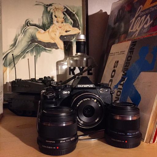 Keywords: electronics lens camera indoor Olympus OM-D E-M5 Mark II with Olympus' version of the Tres Amigos; 17/1.8, 25/1.8 and 45/1.8. Olympus OM-D E-M5 Mark II with Olympus' version of the Tres Amigos; 17/1.8, 25/1.8 and 45/1.8.