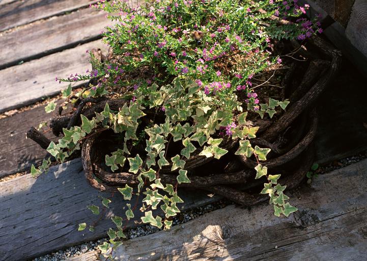 Keywords: potted pot outdoor decoration grow green white leaf patio furnishing outside gardening plank porch overgrow wood decorative ivy garden plant terrace wooden gardener background