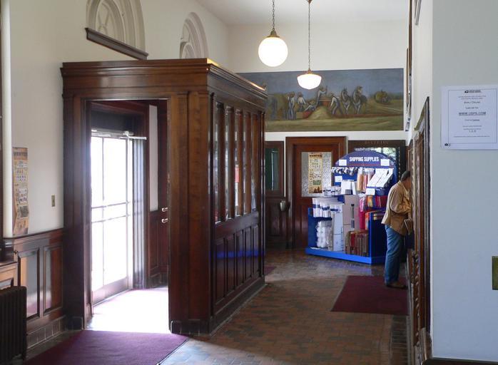 | Keywords: O'Neill, Nebraska post office interior 2.JPG U S Post Office in w O'Neill Nebraska ; camera is facing south The Colonial Revival building was constructed in 1936 It is listed in the National Register of Historic Places The vestibule at left leads to the main east entrance On the south wall is a mural by Eugene Trentham titled Baling Hay in Holt County in the Early Days installed in 1938 own Ammodramus 2010-06-15 Pictures by Ammodramus Taken with Panasonic Lumix DMC-FZ20 O'Neill Nebraska post office Murals in Nebraska |