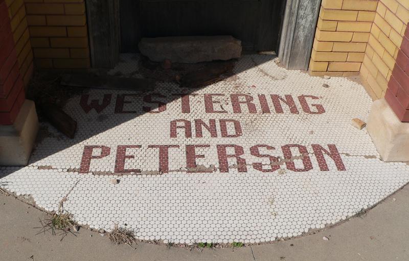 Keywords: Ong, Nebraska Westering and Peterson 1 tiles.JPG Ong Nebraska tile at main southeast entrance The building was constructed ca 1906 own Ammodramus 2010-10-19 Pictures by Ammodramus Taken with Panasonic Lumix DMC-FZ20 Westering and Peterson Building Ong Nebraska |