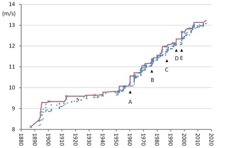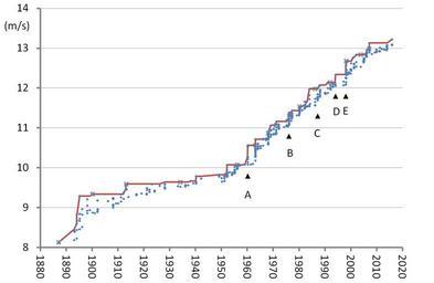 Keywords: Ontwikkeling schaatstijden over 10km.png Ontwikkeling schaatssnelheid over 10 km De snelheid van de topschaatsers over de 10 000 meters in meter/seconde is uitgezet tegen de jaren De rode lijn is de wereldrecordsnelheid De blauwe punten zijn de beste snelheden per seizoen A - Introductie van de kunstijsbaan B - Doorbraak van het aerodynamische schaatspak C - Introductie van de indoor kunstijsbaan D - Introductie van de klapschaats E - Introductie van de aerodynamische strips Bron http //evertstenlund se/d10k htm Evert Stenlund Development of skating speed over 10 000 m The speed of top skaters over 10 000 meters is displayed over the years The red line is de world record speed The blue dots are various best times per season A - Introduction of the artificial ice rink B - Breakthrough of the aerodynamic suit C - Introduction of the indoor ice rink D - Introduction of the clap skate E - Introduction of the aerodynamic strips Data source http //evertstenlund se/d10k htm Evert Stenlund own 2005 2011 Jan Arkesteijn Jan Arkesteijn Ice skating Sports world records Line charts |