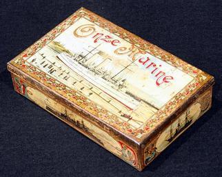 | Keywords: Onze Marine cigarenblik, foto 1.JPG Very old packaging of a Dutch product that is not produced and/or not sold any more Photographed at a collector of Droste memorabilia and old tin cans Rechthoekig scharnierend deksel Op alle zijden een schip zowel stoomschepen als zeilschepen in goud rood en blauw Elke voorstelling omrand met attributen uit de marine ankers stuurwiel reddingboei sabels vaandel Deksel 'Onze Marine/H M Zeeland Zijkant voor 'H M Koningin Wilhelmina der Nederlanden' Zijkant achter 'H M Pantserschip Piet Hein' Zijkant rechts 'H M Fregat Joh Wil Friso For more info see http //www tincollectors nl/ tincollectors nl or email info tincollectors nl own 2014-04-11 11 51 29 Alf van Beem CC-Zero Trademarked Cigar tins Onze Marine cigars |