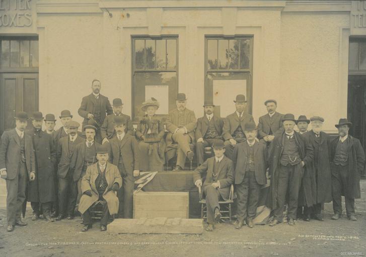 Keywords: green island greenisland historic dunedin outdoor DCC Archives, Green Island Borough Council Series, 22/7. Photographer: AW Bathgate . Back row from left: Councillor E Reeve, Cr C Blackwood, Mrs J Lindsay (Mayoress), Hon T McKenzie, J Lindsay (Mayor), W Geddes (late Mayor), T Thomson (Town Clerk). Second Row: R Scott (Contractor for Water Works), FW Furkitt (Engineer Public Works Dept), another Public Works engineer, Cr R Waters, TJ Williams (Engineers for Water Works), Cr A Kane, Cr GV Price, Cr W Wynn (from Public Works Dept), Rev J Kilpatrick, Mr Murphy, resident, Cr A Crimp. Seated left Cr J jenkins, Cr H Christie. DCC Archives, Green Island Borough Council Series, 22/7. Photographer: AW Bathgate . Back row from left: Councillor E Reeve, Cr C Blackwood, Mrs J Lindsay (Mayoress), Hon T McKenzie, J Lindsay (Mayor), W Geddes (late Mayor), T Thomson (Town Clerk). Second Row: R Scott (Contractor for Water Works), FW Furkitt (Engineer Public Works Dept), another Public Works engineer, Cr R Waters, TJ Williams (Engineers for Water Works), Cr A Kane, Cr GV Price, Cr W Wynn (from Public Works Dept), Rev J Kilpatrick, Mr Murphy, resident, Cr A Crimp. Seated left Cr J jenkins, Cr H Christie. |