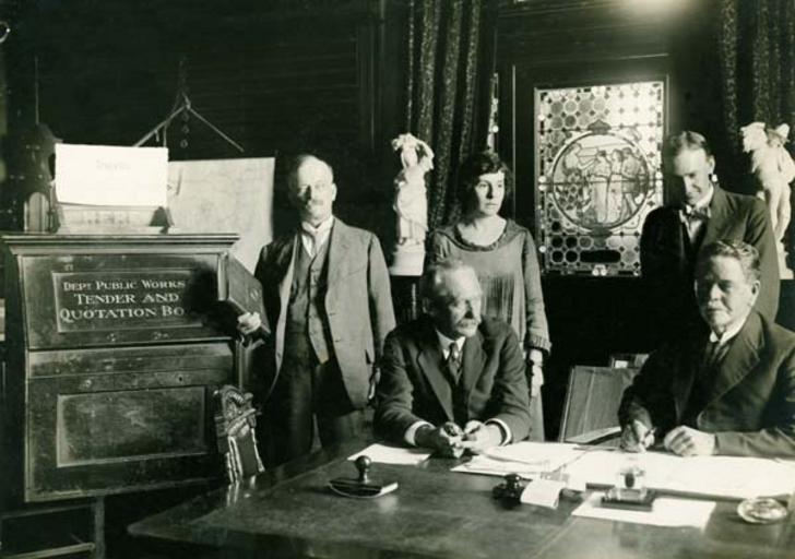 Keywords: archives state records nsw staterecordsnsw newsouthwales blackandwhite sydney harbour bridge sydneyharbourbridge people bradfield women fashion clothing black and white Title: Opening of Tenders From left to right:-Seated: Mr. T. B. Cooper (Under-Secretary for Works), Mr. R. T. Ball (Minister for Works and Railways). Standing: Mr. J. J. C. Bradfield (Engineer-ln-Chief and Designer of the Bridge), Miss Kathleen Butler (confidential secretary to Mr. Bradfield). Mr. Swift (private secretary to the Minister for Works). Dated: 16/01/1924 Digital ID: 12685_a007_a00704_8722000064r Rights: www.records.nsw.gov.au/about-us/rights-and-permissions We'd love to hear from you if you use our photos/documents. Many other photos in our collection are available to view and browse on our website using Photo Investigator. Title: Opening of Tenders From left to right:-Seated: Mr. T. B. Cooper (Under-Secretary for Works), Mr. R. T. Ball (Minister for Works and Railways). Standing: Mr. J. J. C. Bradfield (Engineer-ln-Chief and Designer of the Bridge), Miss Kathleen Butler (confidential secretary to Mr. Bradfield). Mr. Swift (private secretary to the Minister for Works). Dated: 16/01/1924 Digital ID: 12685_a007_a00704_8722000064r Rights: www.records.nsw.gov.au/about-us/rights-and-permissions We'd love to hear from you if you use our photos/documents. Many other photos in our collection are available to view and browse on our website using Photo Investigator. |