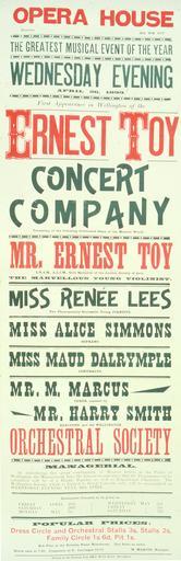 | Keywords: text Arrangement of varied text styles, Victorian and Art Nouveau. Quantity: 1 colour photo-mechanical print(s). Physical Description: Letterpress 895 x 290 mm. Evening Post (Wellington, N.Z.). Opera House [Wellington] :Ernest Toy Concert Company ... Wednesday evening, April 26, 1899. Printed at the Evening Post Office, Willis Street, Wellington [1899]. Ref: Eph-E-MUSIC-1899-01. Alexander Turnbull Library, Wellington, New Zealand. natlib.govt.nz/records/22856724 Arrangement of varied text styles, Victorian and Art Nouveau. Quantity: 1 colour photo-mechanical print(s). Physical Description: Letterpress 895 x 290 mm. Evening Post (Wellington, N.Z.). Opera House [Wellington] :Ernest Toy Concert Company ... Wednesday evening, April 26, 1899. Printed at the Evening Post Office, Willis Street, Wellington [1899]. Ref: Eph-E-MUSIC-1899-01. Alexander Turnbull Library, Wellington, New Zealand. natlib.govt.nz/records/22856724 |