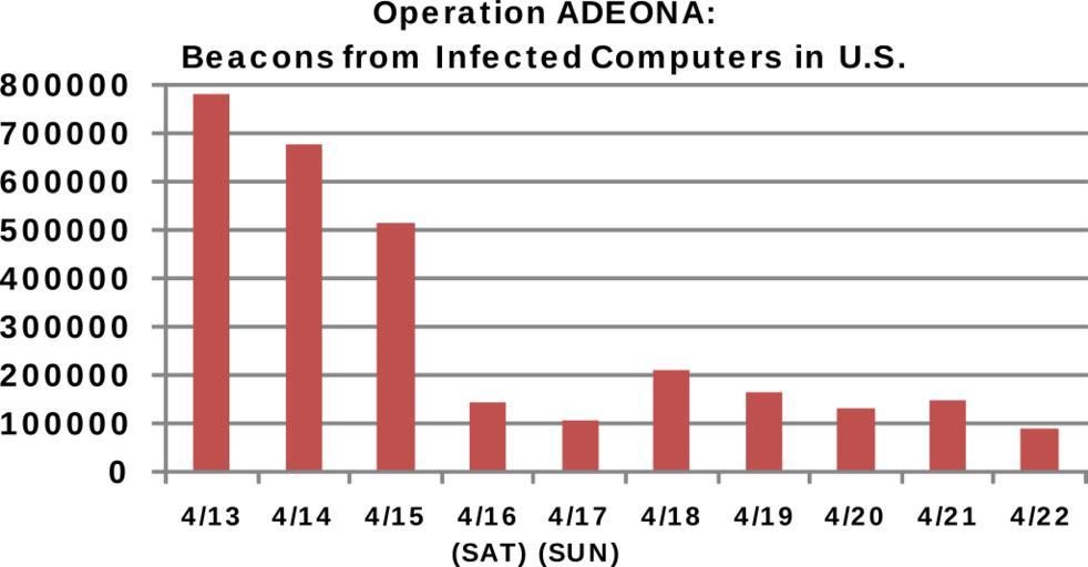 Keywords: Operation ADEONA coreflood.svg en A graph illustrating the number of Coreflood Beacons per Day following Operation ADEONA Please note While the beacons per day BPD metric is a reasonable measure of the size of the Coreflood Botnet it is not the same as the number of infected computers because an infected computer may be re-started several times per day increasing the BPD or not re-started or turned on at all decreasing the BPD The actual number of infected computers in the Coreflood Botnet is not known notwithstanding the Government ™s control of the substitute servers because the Government is not receiving content from the infected computers including content that would enable the Government to uniquely identify each infected computer http //www justice gov/opa/documents/coreflood-govt-supp pdf FBI 4-23-2011 PD-USGov Botnet Uncategorized 2015 February 4 |
