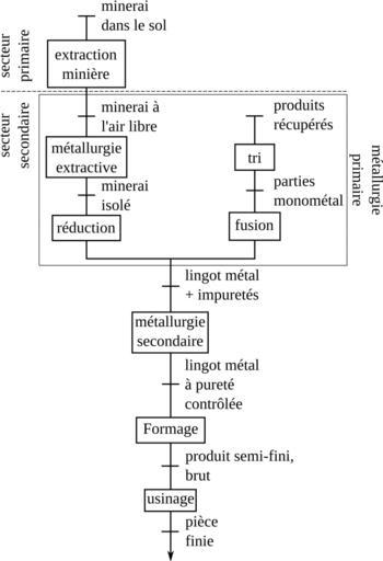 | Keywords: Operations generales metallurgie.svg en General process from ore/recycling to finished metal part fr Procédé général de fabrication d'une pièce métallique depuis l'extraction du minerai ou le recyclage d'une pièce au rebut own Cdang 2009-07-06 Metallurgy |