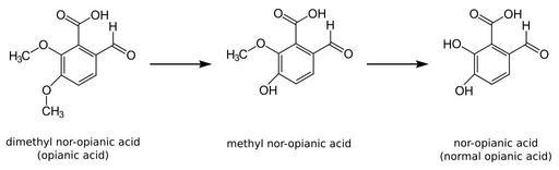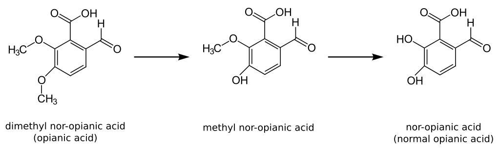Keywords: Opianic acid demethylation.svg en Demethylation of opianic acid The reaction of opianic acid with strong hydrochloric or hydriodic acid is already described in 1867 by A Matthiessen and G C Foster http //books google com/books id tKsOAAAAIAAJ pg PA39 Researches into the chemical constitution of narcotine and of its products of decomposition The successively showed compounds are 6-formyl-2 3-dimethoxybenzoic acid; 6-formyl-3-hydroxy-2-methoxybe ‹nzoic acid and 6-formyl-2 3-dihydroxybenzoic ‹acid own Wickey-nl 2010-11-17 Opianic acid Demethylation reactions |