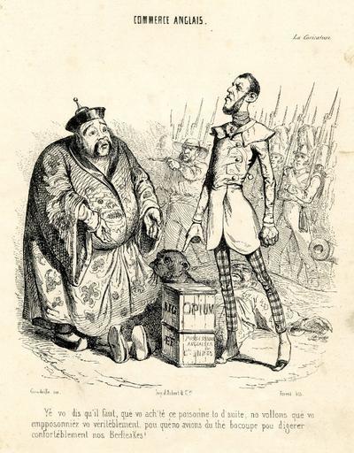 | Keywords: Opium War.jpg en Satire showing an Englishman ordering the emperor of China to buy opium Another Chinese man lies dead on floor with troops in background one man poised to fire a gun The text says I tell you to immediately buy the gift here We want you to poison yourself completely because we need a lot of tea in order to digest our beefsteaks fr 'Yé vo dis qu'il faut / pou digerer confortéblement nos Beefteakes ' de Warum England den Opiumkrieg entfesselte Diese Zeichnung von Jean Grandville aus dem Charivari 1840 trägt die Unterschrift Ihr müsst dies Gift sofort kaufen sagt der Engländer wir wollen dass ihr euch vollkommen vergiftet damit wir genug Tee haben um unsere Beefsteaks zu verdauen no På bildet ser vi engelskmannen gi den kinesiske keiseren ordre om å kjøpe masse opium Teksten Jeg sier deg at du straks skal kjøpe denne giften her Vi vil at dere skal forgifte dere voldsomt mye for vi trenger masse te for å kunne fordøye biffen vår http //kharoozo livejournal com/2726734 html Live Journal Originally in Charivari 1840 Jean-Jacques Grandville PD-art-100 First Opium War 1840s political cartoons Grandville caricaturist |