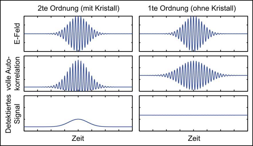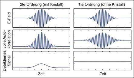 Keywords: Optische Autokorrelation.svg de Optisches Autokorrelationssignal erster und zweiter Ordnung eines optischen Pulses V o n u E-Feld des Pulses volles Autokorrelationssignal interferometrisch und mit dem Autokorrelator gemessenes Signal Tiefpass Links mit Kristall rechts ohne Kristall own Lukie 80 2011 09 12 Cc-zero Nonlinear optics |