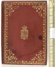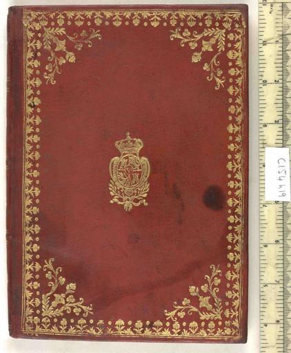 Keywords: Oracion funebre, que en las solemnes exequias de fin de ano, celebradas ... - Upper cover (c154h19).jpg Style Armorial Frame; Caption Upper cover; Colour Red; Edge Unspecified exhibition history Decorative Technique Tooled in gold; Cover Material Goatskin includes morocco turkey etc Part of the Charles Ramsden Collection of Signed Bindings In a contemporary gold-tooled red morocco binding with the royal arms of Spain may be Charles IV object history Text 1790; Madrid; Charles IV King of Spain d1819 object type Cc-zero place of creation Binding Spain place of discovery Works on Spanish bookbindings include Hispanic Society of America An Album of Selected bookbindings New York 1967 by C L Penney; M Lopez Serrano Biblioteca de Palacio Encuadernaciones Madrid 1950; H Thomas Early Spanish Bookbindings London 1939 British Library image http //www bl uk/catalogues/bookbindings/LargeImage aspx RecordId 020-000001344 ImageId ImageId 40277 Copyright BL Oracion funebre que en las solemnes exequias de fin de ano celebradas Uploaded with GWToolset Oracion funebre que en las solemnes exequias de fin de ano celebradas - Upper cover c154h19 http //www webarchive org uk/bldatasets/bindings/4864_4 jpg Bookbinding 18th-century bookbinding British Library Bookbindings