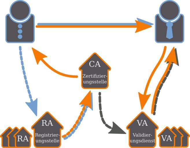 Keywords: Orange blue public key infrastructure 1 de.text.svg en Principle of a public key infrastructure A user applies for a certificate with his public key at a registration authority RA The latter confirms the user's identity to the certification authority CA which in turn issues the certificate The user can then digitally sign a contract using his new certificate His identity is then checked by the contracting party with a validation authority VA which again receives information about issued certificates by the certification authority de Prinzip einer Public-Key-Infrastructure Teilnehmer authentifiziert sich gegenüber Registrierungstelle diese bestätigt den öffentlichen Schlüssel des Teilnehmers gegenüber der Zertifizierungsstelle Die Zertifizierungsstelle stellt dem Teilnehmer ein Zertifikat aus Der Teilnehmer kann sich gegenüber einer anderen Person/Entität mit dem Zertifikat authentifizieren Die andere Person/Entität kann das Zertifikat von einem Validierungsdienst überprüfen lassen 2012-06-15 own Bananenfalter <gallery> File Public-Key-Infrastructure svg Original version File Orange blue public key infrastructure 1 de svg Preferred version </gallery> Similar Images <gallery> File Orange blue public key infrastructure 2 de text svg PKI with text File Orange blue public key infrastructure 3 de text svg PKI detail registration File Orange blue public key infrastructure 4 de text svg PKI detail verification </gallery> cc-zero translatable Uploaded with UploadWizard Orange blue cryptography diagrams |