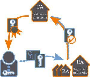 Keywords: Orange blue public key infrastructure 3 de.text.svg en Principle of a public key infrastructure A user applies for a certificate with his public key at a registration authority RA The latter confirms the user's identity to the certification authority CA which in turn issues the certificate de Prinzip einer Public-Key-Infrastructure Teilnehmer authentifiziert sich gegenüber Registrierungstelle diese bestätigt den öffentlichen Schlüssel des Teilnehmers gegenüber der Zertifizierungsstelle Die Zertifizierungsstelle stellt dem Teilnehmer ein Zertifikat aus 2012-06-15 own Bananenfalter <gallery> File Public-Key-Infrastructure svg Original version File Orange blue public key infrastructure 3 de text svg Preferred version </gallery> Similar Images <gallery> File Orange blue public key infrastructure 1 de text svg PKI without text File Orange blue public key infrastructure 2 de text svg PKI with text File Orange blue public key infrastructure 4 de text svg PKI detail verification </gallery> cc-zero translatable Uploaded with UploadWizard Orange blue cryptography diagrams Infrastructure diagrams |