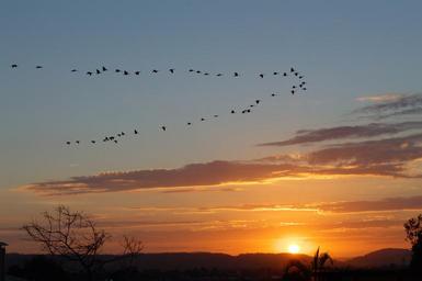 Keywords: orange sunset birds flying home soft afternoon clouds