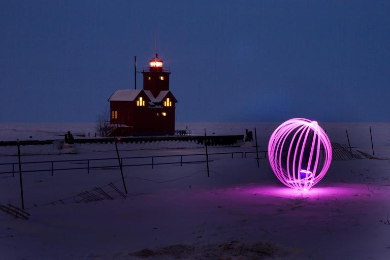 Keywords: orb long exposure lights night lighthouse winter red snow ice landscape cold nautical michigan lilac artictic