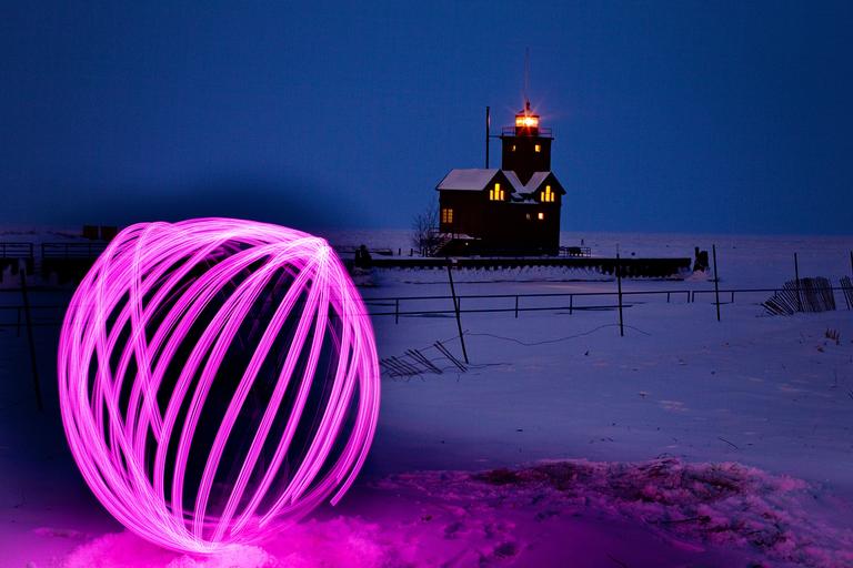 Keywords: orb long exposure lights night lighthouse winter red snow ice landscape cold nautical michigan lilac artictic