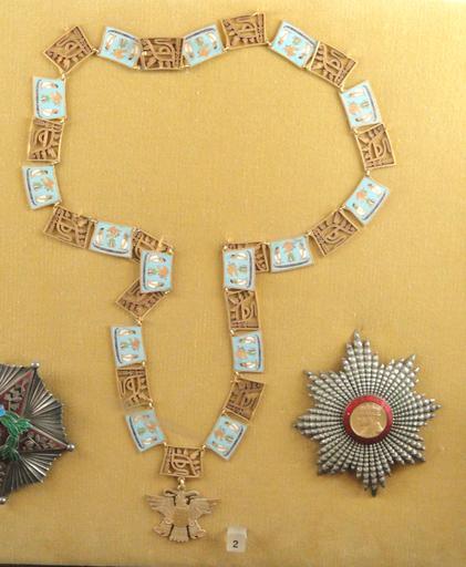 Keywords: Order of the Aztec Eagle - Grand Cordon (Mexico) - Memorial JK - Brasilia - DSC00377.JPG IExhibit in the Memorial JK Brasília Brazil Image depicts the Grand Cordon collar of the Order of the Aztec Eagle centre and breast star of a Knight Grand Cross of the Order of the British Empire right Daderot 2012-05-30 07 45 18 Daderot cc0 cc0 Exhibits in the Memorial JK Order of the Aztec Eagle Livery collars |