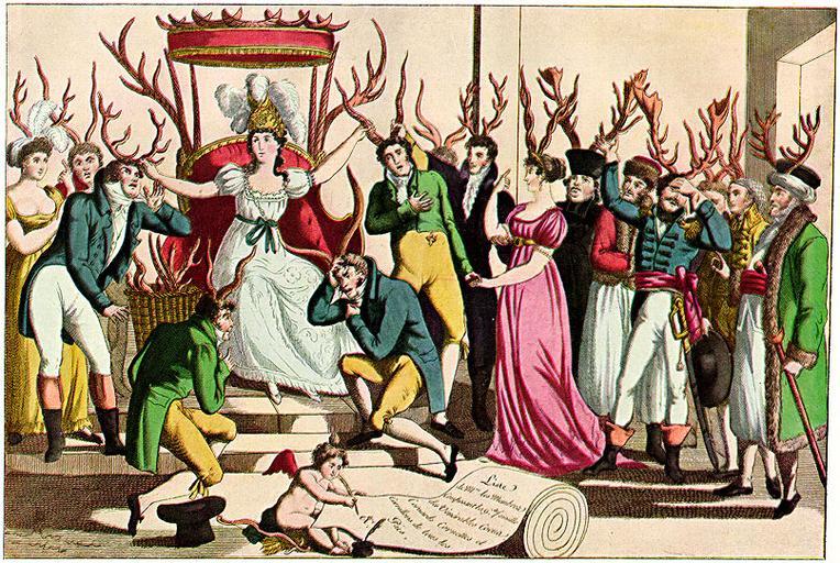 Keywords: Order-cuckoldry-ca1815-French-satire.jpg La fête de l'Ordre des Cocus devant le trône de Sa Majesté Infidélité The celebration fête of the Order of Cuckoldry before the throne of her majesty Infidelity A satirical colored French print ca 1815 that parodies knightly orders such as the English order of the Garter etc etc which traditionally held annual feasts on the day of the patron-Saint of the order This caricature makes full use of the traditional European folkloric metaphor that the husband of a sexually unfaithful wife has horns on his head In fact all the individuals shown except Infidelity herself her servant cupid and the fifth person from the right are wearing horns -- and there's a basket of extra horns to the left of the throne and the canopy above the throne is decorated with smaller horns Note the gentlemen from non-Western-European nations at the right of the picture and also the lady in the pink dress who is firmly calling her husband's attention to the horns on her own head Most of the members of the Order look none too pleased with the honor The huge scroll at bottom is a membership list; the cupid is writing on the scroll Liste de Msrs les Membres Composant la gde famille de Vénérables Cocus Cornards Cornettes et Cornillons de tous les Pais c modern French spelling is pays An approximate English translation would be List of members composing the grand family of honorable cuckolds of all nations etc with a list of synonyms and pseudo-synonyms for cuckold in the original French Caricatures of France Marriage in art Human sexuality in art 1810s fashion Adultery Non-monogamy PD-old-100 |