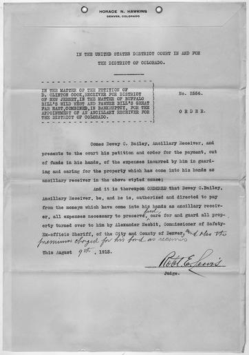 | Keywords: Order to pay expenses - NARA - 292700.tif Scope and content This order directs the receiver to pay for the care safeguarding and feeding of the former assets of the Wild West Show in his possession General notes 292700 Local identifier U S District Court for the District of Colorado 1876 - NARA's Rocky Mountain Region Denver NRGA Building 48 Denver Federal Center West 6th Avenue and Kipling Street Denver CO 80225-0307 1913-08-09 Record group Record Group 21 Records of District Courts of the United States 1685 - 2004 Record group ARC 350 Bankruptcy Case Files compiled 1876 - 1948 Series ARC 292683 File unit Petition for Ancillary Receiver in Re Buffalo Bill's Wild West and Pawnee Bill's Great Far East Combined 07/31/1913 - 09/26/1913 File unit ARC 292684 Variant control numbers NAIL Control Number NRG-21-E19-2556-ORDER4 yes Other versions NARA-cooperation PD-USGov Buffalo Bill's Wild West Show |