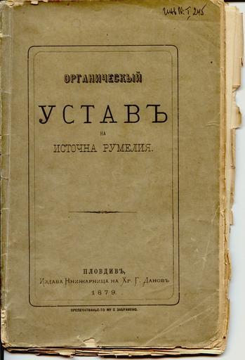 | Keywords: Organic-Statute-Eastern-Rumelia.jpg О ганически устав на Източна Румелия Organic Statute of Eastern Rumelia own scanned 1879 European Commision PD-old Title pages from Bulgaria Law of Bulgaria Constitutions 1879 documents Eastern Rumelia Law of the Ottoman Empire Books in Bulgarian Books from Eastern Rumelia |