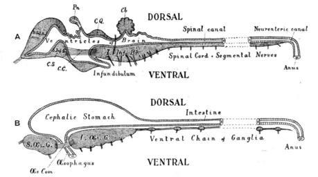 Keywords: Origin of Vertebrates Fig 003.png Fig 3 ”Vertebrate Central Nervous System compared with the Central Nervous System and Alimentary Canal of the Arthropod A Vertebrate central nervous system S Inf Br supra-infundibular brain; I Inf Br infra-infundibular brain and cranial segmental nerves; C Q corpora quadrigemina; Cb cerebellum; C C crura cerebri; C S corpus striatum; Pn pineal gland B Invertebrate central nervous system S Å’s G supra-Å“sophageal ganglia; I Å’s G infra-Å“sophageal ganglia; Å’s Com Å“sophageal commissures 1908 The Origin of Vertebrates https //archive org/details/originofvertebra1908gask Walter Holbrook Gaskell PD-old-auto-1923 1914 Origin of Vertebrates book Central nervous system |
