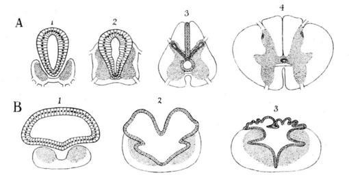 Keywords: Origin of Vertebrates Fig 021.png Fig 21 ”A Method of Formation of the Vertebrate Spinal Cord from the Ventral Chain of Ganglia and the Intestine of an Arthropod represented in 1; B Method of Formation of the Vertebrate Medulla Oblongata from the Infra-Å“sophageal Ganglia and the Cephalic Stomach of an Arthropod 1908 The Origin of Vertebrates https //archive org/details/originofvertebra1908gask Walter Holbrook Gaskell PD-old-auto-1923 1914 Origin of Vertebrates book Invertebrate brain |
