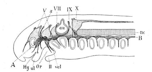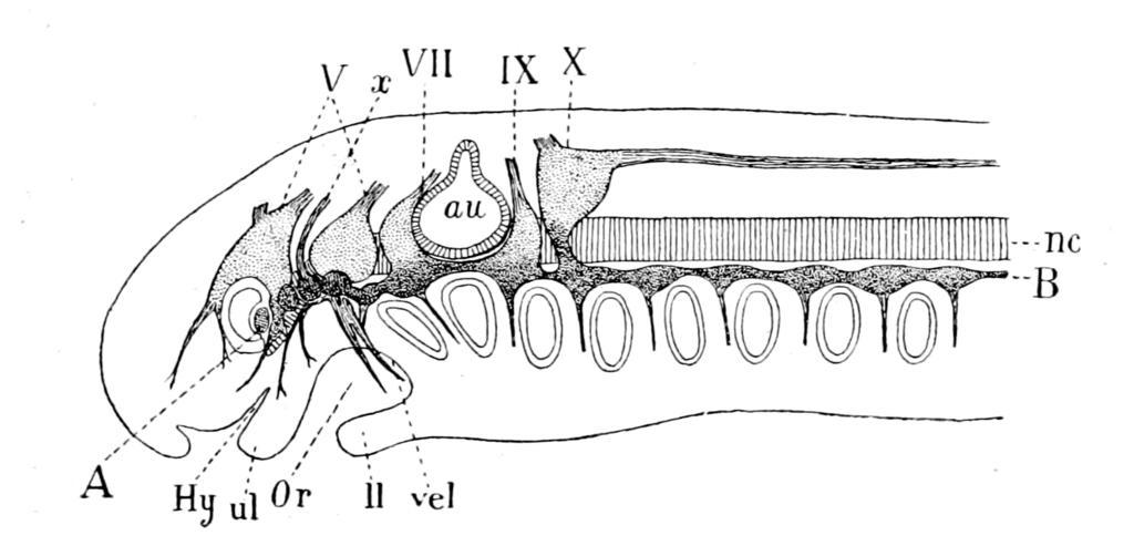 Keywords: Origin of Vertebrates Fig 113.png Fig 113 ”Ganglia of the Cranial Nerves of an AmmocĹ“tes 4 mm in length projected on to the Median Plane After Kupffer A-B the line of epibranchial ganglia; au auditory capsule; nc notochord; Hy tube of hypophysis; Or oral cavity; u l upper lip; l l lower lip; vel septum between oral and respiratory cavities; V VII IX X cranial nerves; x nerve with four epibranchial ganglia All references in this work to AmmocĹ“tes or Petromyzon appear to refer to the European Brook Lamprey now called Lampetra planeri 1908 The Origin of Vertebrates https //archive org/details/originofvertebra1908gask Walter Holbrook Gaskell PD-old-auto-1923 1914 Origin of Vertebrates book Lampetra planeri |