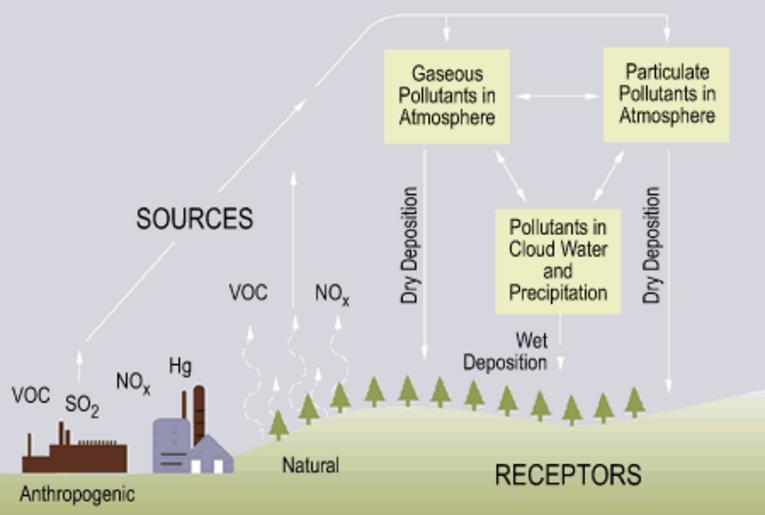 Keywords: Origins.gif Origins_of_acid_rain svg Flow chart showing dry and wet deposition processes <br>Original site Text <br> Power plant emitting substances into the air Acid rain is a broad term referring to a mixture of wet and dry deposition deposited material from the atmosphere containing higher than normal amounts of nitric and sulfuric acids The precursors or chemical forerunners of acid rain formation result from both natural sources such as volcanoes and decaying vegetation and man-made sources primarily emissions of sulfur dioxide SO2 and nitrogen oxides NOx resulting from fossil fuel combustion In the United States roughly 2/3 of all SO2 and 1/4 of all NOx come from electric power generation that relies on burning fossil fuels like coal Acid rain occurs when these gases react in the atmosphere with water oxygen and other chemicals to form various acidic compounds The result is a mild solution of sulfuric acid and nitric acid When sulfur dioxide and nitrogen oxides are released from power plants and other sources prevailing winds blow these compounds across state and national borders sometimes over hundreds of miles Flow chart showing dry and wet deposition processes If you have difficulty viewing this graphic or need additional information contact Cindy Walke Web Manager at 202-343-9194 Wet Deposition Wet deposition refers to acidic rain fog and snow If the acid chemicals in the air are blown into areas where the weather is wet the acids can fall to the ground in the form of rain snow fog or mist As this acidic water flows over and through the ground it affects a variety of plants and animals The strength of the effects depends on several factors including how acidic the water is; the chemistry and buffering capacity of the soils involved; and the types of fish trees and other living things that rely on the water Dry Deposition In areas where the weather is dry the acid chemicals may become incorporated into dust or smoke and fall to the ground through dry deposition sticking to the ground buildings homes cars and trees Dry deposited gases and particles can be washed from these surfaces by rainstorms leading to increased runoff This runoff water makes the resulting mixture more acidic About half of the acidity in the atmosphere falls back to earth through dry deposition http //www3 epa gov/acidrain/what/ >http //www epa gov/acidrain/images/origins gif gif 2012-11-05 servertimestamp n/a PD-USGov original upload log page en wikipedia Origins gif 2006-02-12 16 41 NHSavage 450×303× 13412 bytes <nowiki>Downloaded from US EPA website http //www epa gov/acidrain/origins gif</nowiki> Acid rain |