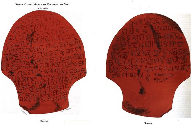 | Keywords: Oriya land grant.jpg en A facsimile of an inscription on a copper plate recording a land grant made by Rāja Purushottam Deb king of Orissa in the fifth year of his reign 1483 The Indian Antiquary December 6 1872 p 355 J Beames 1872-12-06 Medieval Indian Land Grant in Oriya script PD-old History of Odisha Copper plate inscriptions in Odisha 1483 in India |