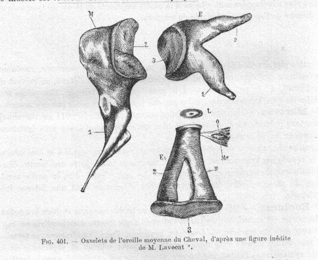 | Keywords: OrMoyenneChauveau1890MeyCh.jpg en The small bones of the middle ear of the horse Equus caballus fr Les osselets de l'oreille moyenne du cheval Equus caballus E enclume Et étrier L lenticulaire M marteau <br /> ” Chauveau Auguste Arloing Saturnin Traité d'anatomie comparée des animaux domestiques <br /> 1 064 p page 950 1890 Paris Lib J B Baillière et Fils domaine public décès des auteurs 1917 et 1911 Meyer Ch 2011-03-23 PD-old Horse bones Horse ears Mammal ear anatomy Ossicles | ||||